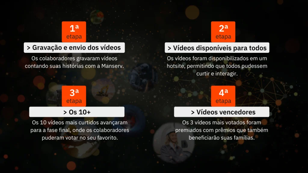 Os colaboradores foram convidados a compartilharem um pouco de sua jornada na Manserv, seja relembrando momentos marcantes, lições aprendidas ou como a empresa contribuiu para a conquista de seus objetivos.