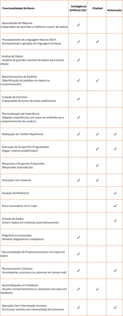 Saiba diferenciar IA, Chatbot e Automatização (inclusive essa tabela foi feita por Inteligência Artificial!):