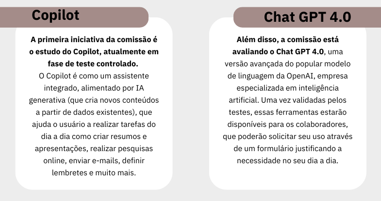 Além disso, a Comissão de Governança de IA tem o compromisso de conscientizar os colaboradores sobre a importância de absorvermos os conhecimentos da Inteligência Artificial, seus benefícios, sem abrir mão da segurança das informações, e finalmente entender a diferença entre as tecnologias de IA, chatbot e automatização de processos.