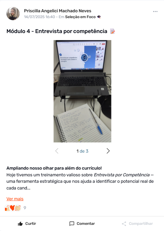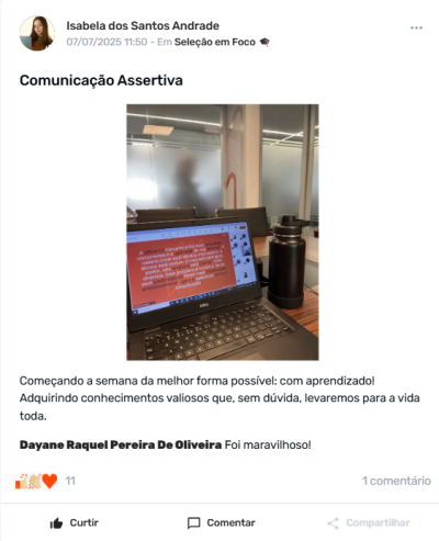 “Estou muito motivada com o treinamento Seleção em Foco, que tem sido gratificante e veio no momento certo. As aulas se conectam com a nossa realidade e nos ajudam a aprimorar processos do dia-a-dia. Estou encarando como uma grande oportunidade de crescimento e aproveitando ao máximo.”