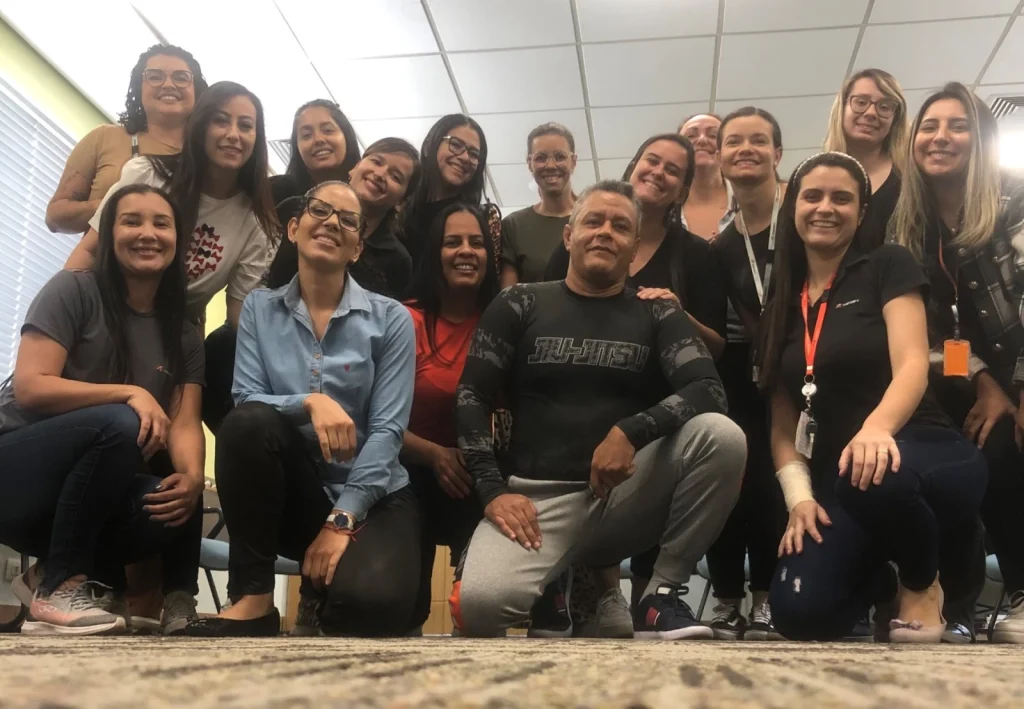 Atividade de defesa pessoal para mulheres ministrada pelo professor de artes marciais Fabio Oliveira. Ação presencial na Sede e transmitida para demais escritórios.